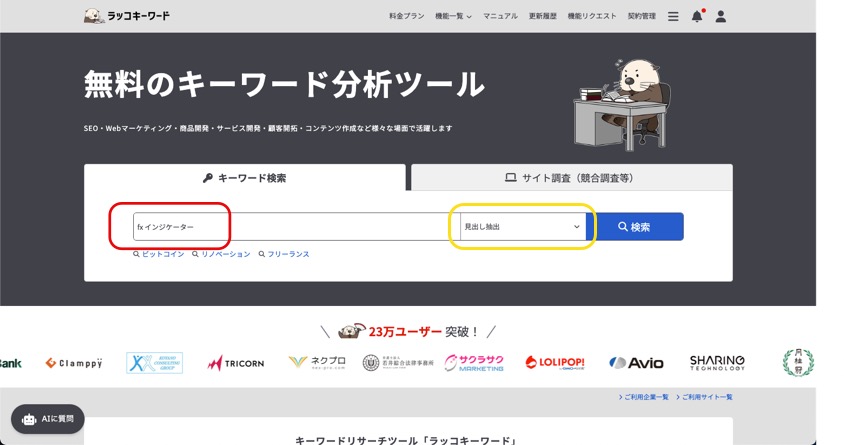 メインページにキーワードを打ち込み、リストから「見出し抽出」を選択して検索します。