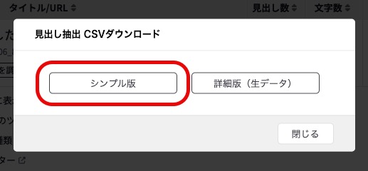 その後、右上の「CSVダウンロード」を押すと次のポップアップ画面が表示されるので、左の「シンプル版」を選択してください。