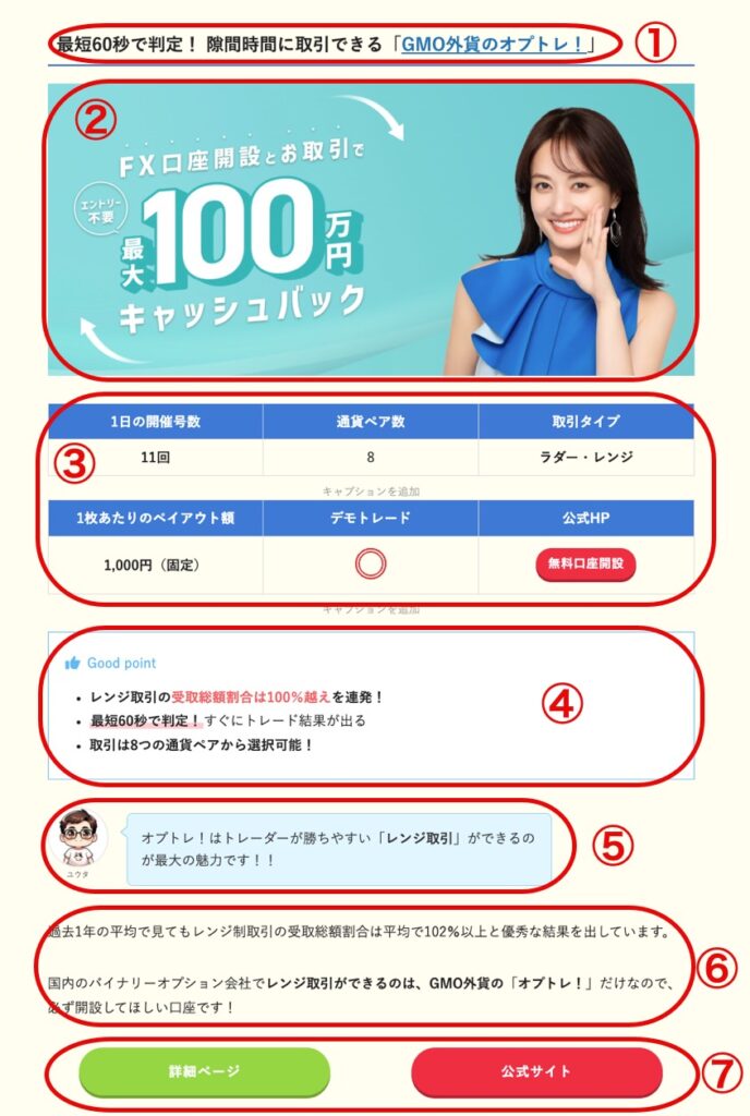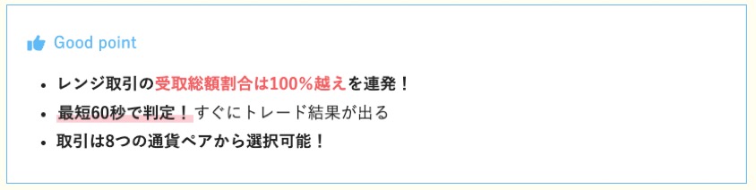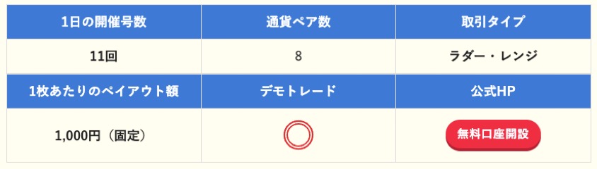 <figure class="wp-block-table is-style-stripes is-all-centered min_width30_ u-mb-ctrl u-mb-0"><table><tbody><tr><td><strong>1日の開催号数</strong></td><td><strong>通貨ペア数</strong></td><td><strong>取引タイプ</strong></td></tr><tr><td><strong>11回</strong></td><td>8</td><td><strong>ラダー・レンジ</strong></td></tr><tr><td><strong>1枚あたりのペイアウト額</strong></td><td><strong>デモトレード</strong></td><td><strong>公式HP</strong></td></tr><tr><td><strong>1,000円(固定)</strong></td><td><span data-icon="doubleCircle" data-icon-size="l" data-icon-type="obj" aria-hidden="true" class="swl-cell-bg"> </span></td><td><span class="swl-inline-btn is-style-btn_solid red_"><a href="ここにアフィリエイトURLを入れる" target="_blank" rel="noreferrer noopener nofollow">無料口座開設</a></span></td></tr></tbody></table></figure>