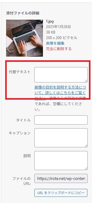 altタグの設定は、WordPressで画像選択したときに右側に表示されるエリア(赤枠部分)で簡単に入力できます。