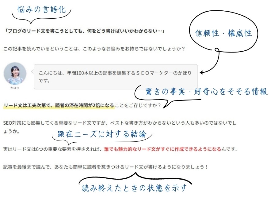 | ④ 読み終えたときの状態を示す | この記事を読み終えるころには、あなたも簡単に読者を惹きつけるリード文が書けるようになっています |