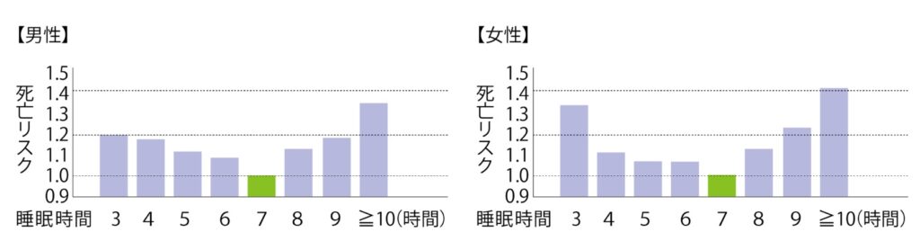 研究データによると、7時間の睡眠は、死亡リスクが最も低く、生活習慣病のリスクも軽減されることが示されています。