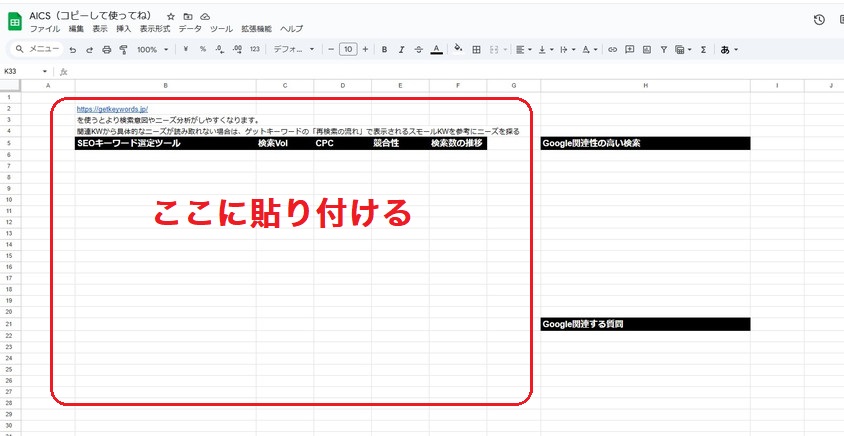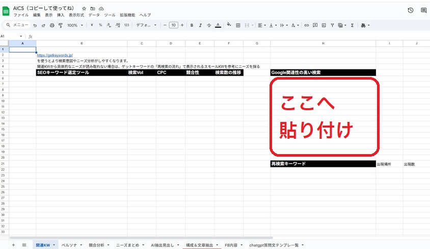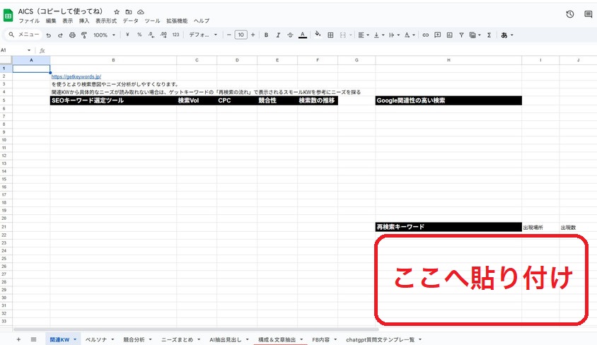 抽出ができたら「キーワードをコピーする」でコピーをして、コンテンツシートに貼り付けましょう。