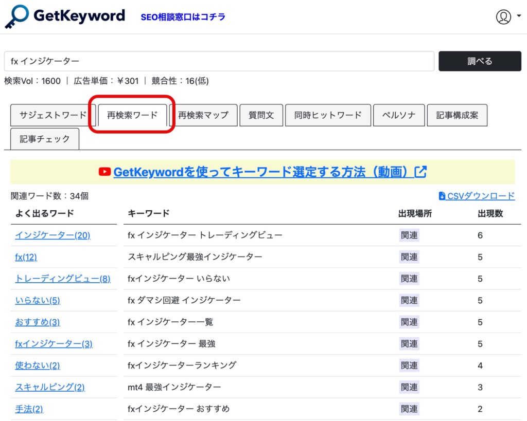 Get Keywordの調査結果を「再検索ワード」に切り替えます。