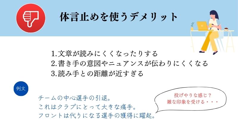しかし、一方で体言止めを使うデメリットもあるので知っておいてください。