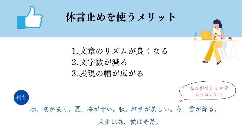 体言止めの一番のメリットは文章のリズム感を良くする点です。